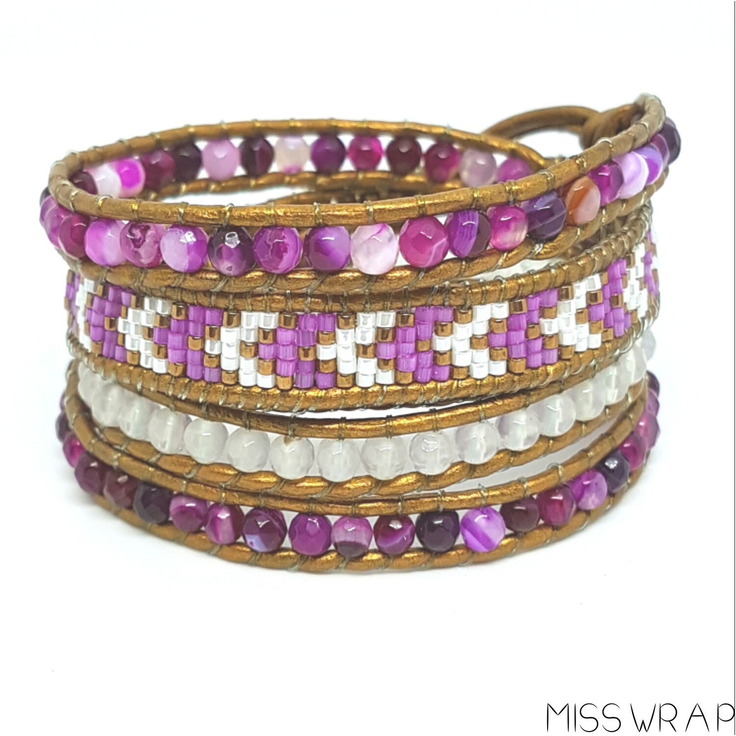 bracelet wrap 5 tours composé d’agates roses et blanches, de miyukis puis de son cordon cuir.