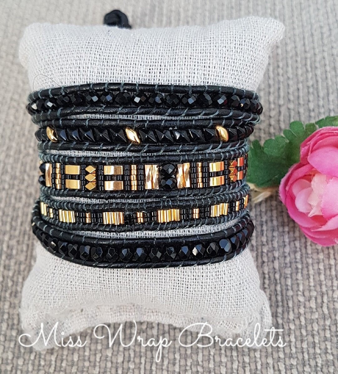 Bracelet wrap 5 tours composé de facettes de bohème, de perles plaquées or(toutes les perles dorées), de miyuki puis de son cordon cuir.