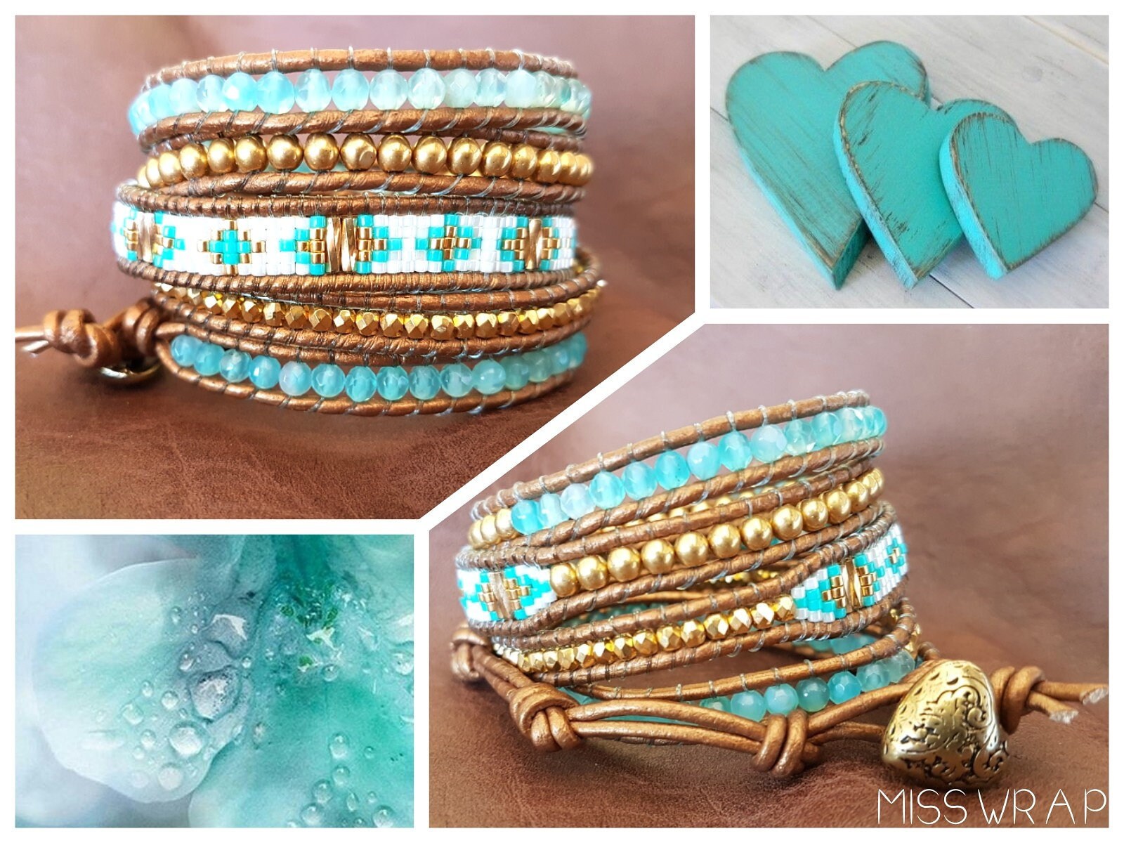 Bracelet wrap 5 tours composé d’un cordon cuir et bouton doré, de 2 rangées en agates turquoises, de perles plaquées or, de miyuki.