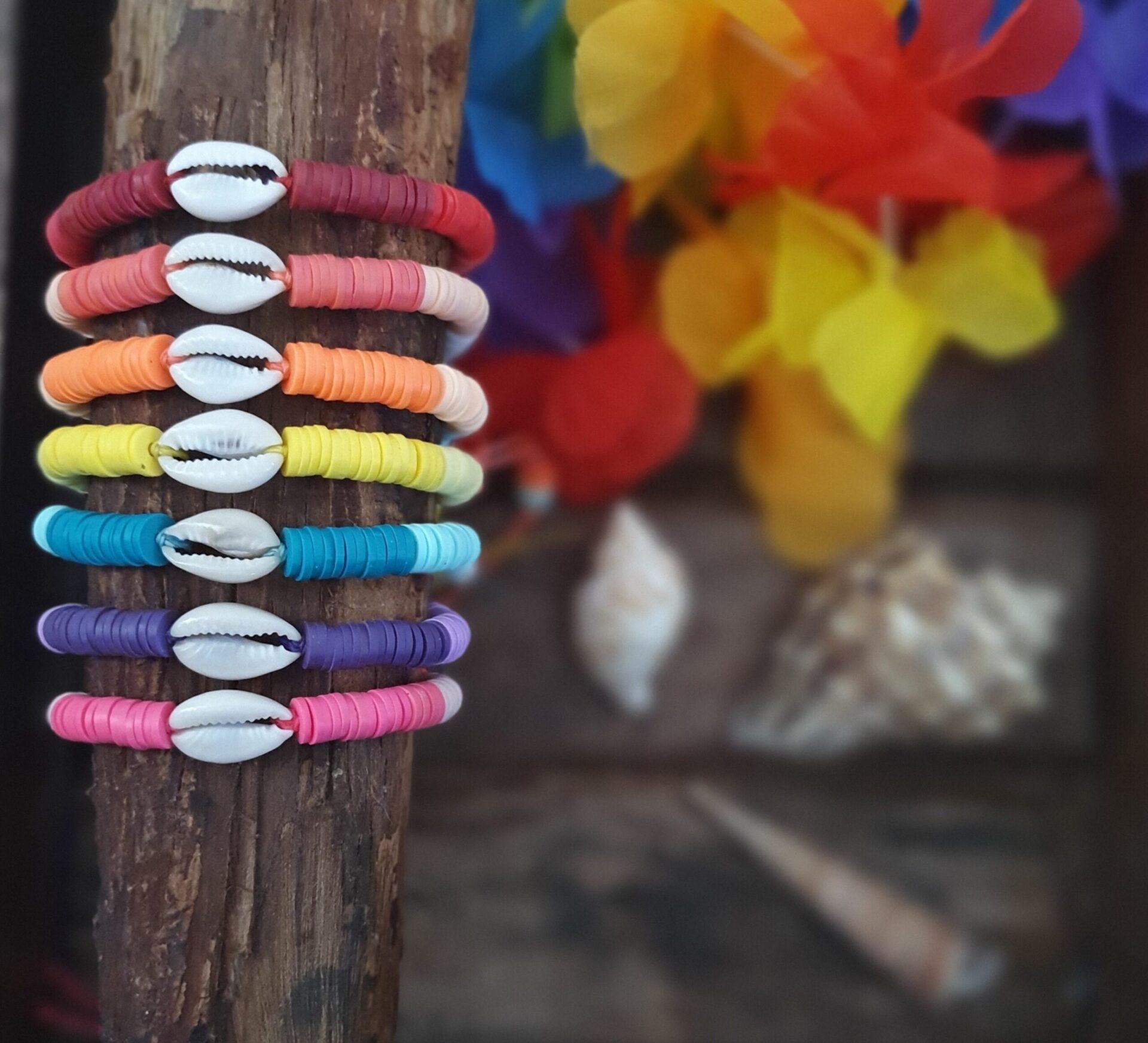 Bracelet en perles heishi et coquillage cauris avec son nœud coulissant macramé à ajuster sur n’importe quelle taille de poignet !