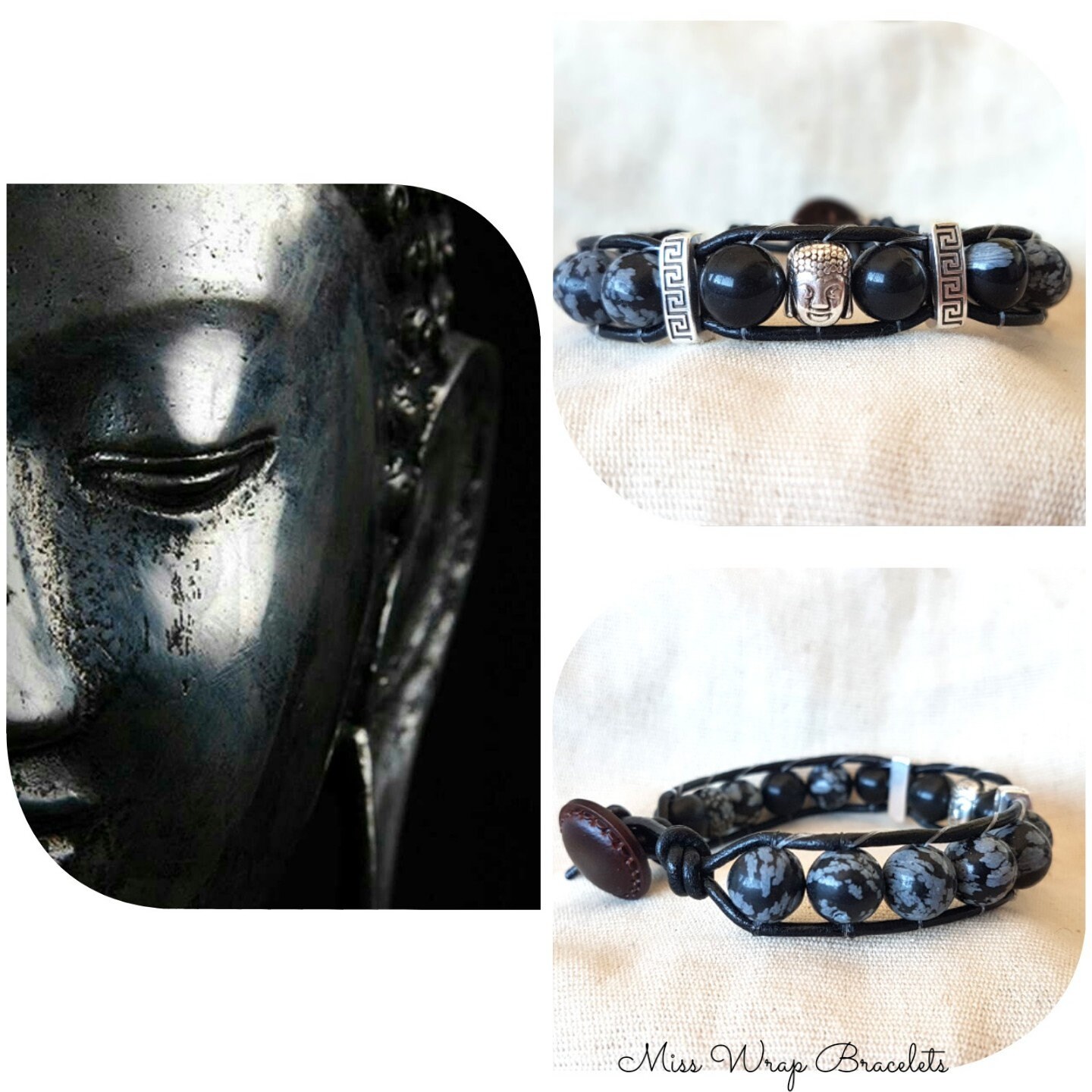 Bracelet wrap 1 tour composé de perles gemmes obsidiennes, de passants métal, d’un bouddha métal puis un cordon cuir.